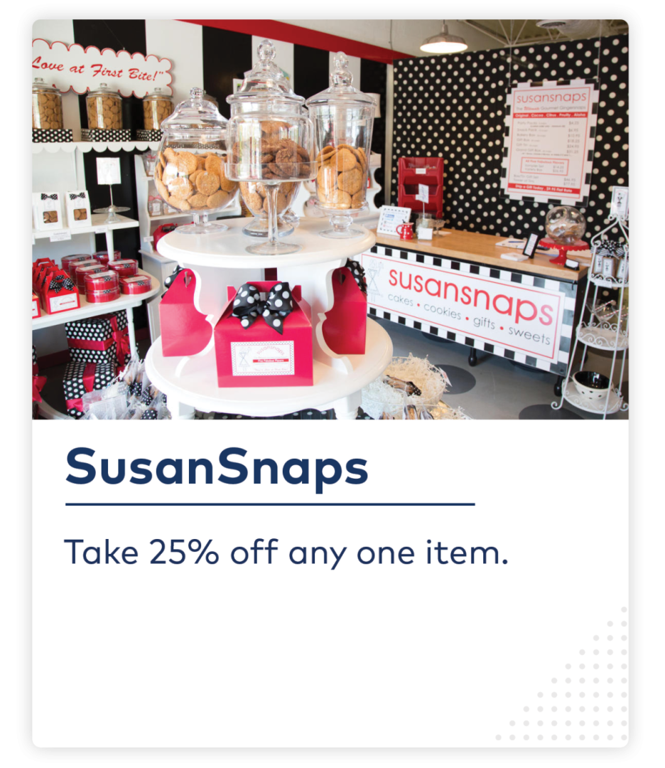 Home Valid January 29, 2026 to January 29, 2027 25% Off Susansnaps Take 25% off any one item. Go to website Save Share Related Susansnaps Locally-owned shop and bakery making gourmet gingersnaps that come in five fabulous flavors...original, cocoa, citrus, pnutty, and aloha.